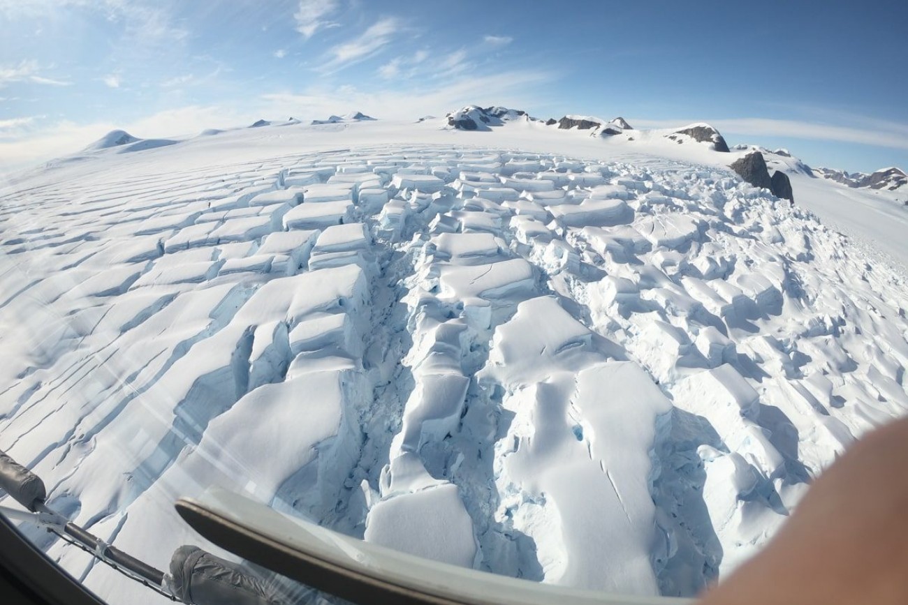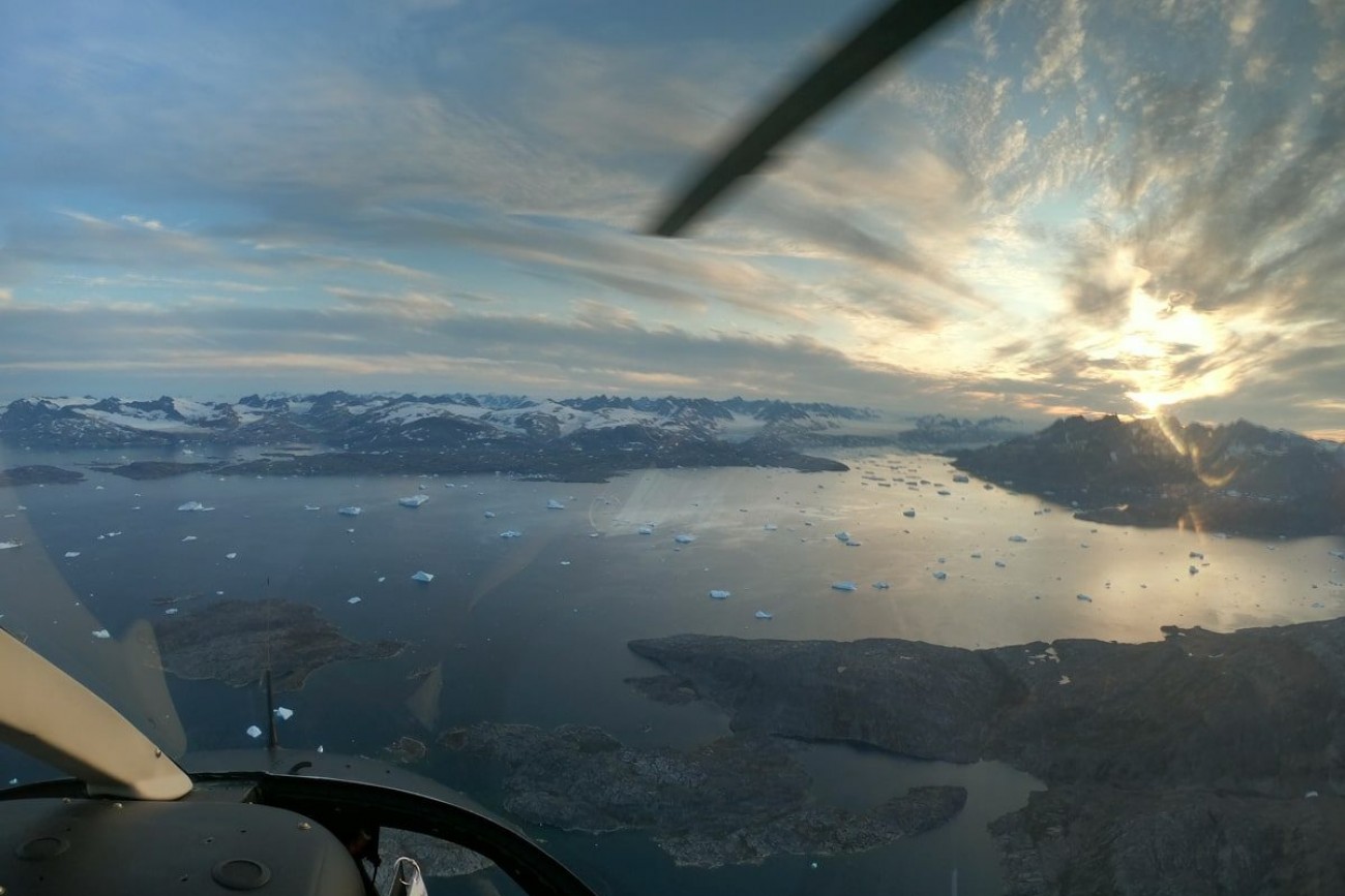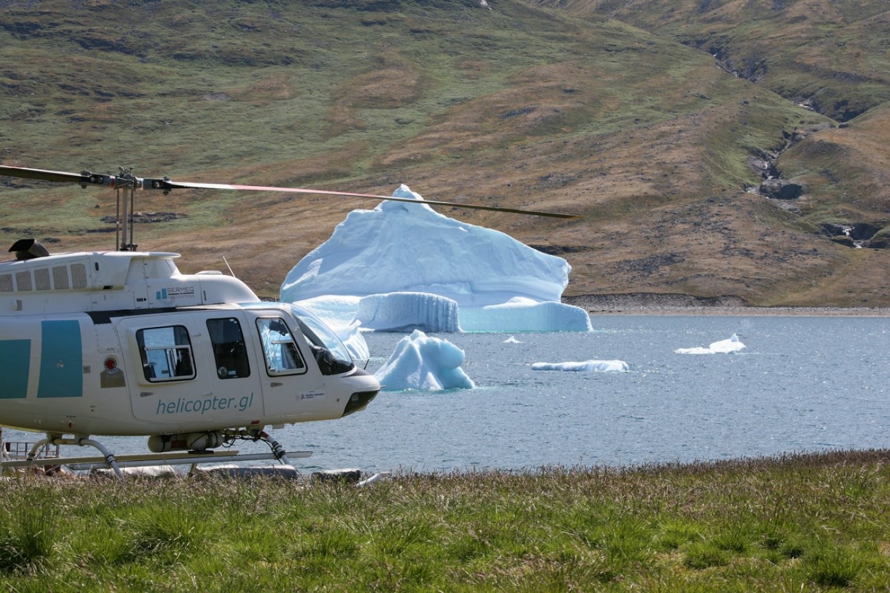 Here at Jacky’s Point, we land next to a 3,5 km wide ice wall that continuously calves huge chucks of ice that fills up the air with rumbling sounds and the fiords with ice –making them impenetrable by normal boats.