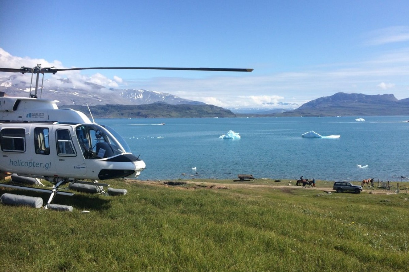 The tour continues flying through green valleys, past the old WW2 air base Narsarsuaq, still active today as a gateway to south Greenland, then land and explore the village of Qassiarsuk. It is the place where the famous Eric the Red settled as the first Viking more than 1000 years ago after being evicted from Iceland, and named the land Greenland, and the village Brattahlid, still populated by modern day Inuit farmers today.